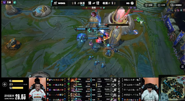 【26:03】中路Jwei璐璐给大配合队友强开WBG下路组,但是Xiaohu阿萝拉大招再次拉满输出,配合Zika大纳尔跳拍两个瞬间秒人!直接收割了战场啊!最终Xiaohu阿萝拉拿下五杀PENTA KILL!WBG团灭iG,从中路带着兵线一路结束比赛!拿到三个赛点!