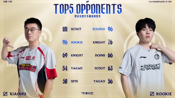 中单对位,双方职业生涯交手最多的选手TOP5如下;