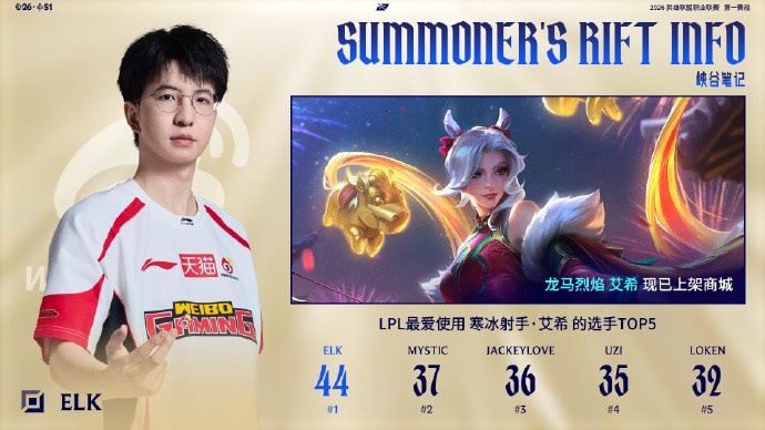 LPL最爱使用艾希的选手TOP5中,Elk以44次使用次数位列第一。