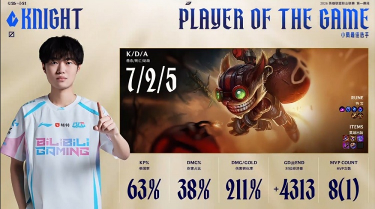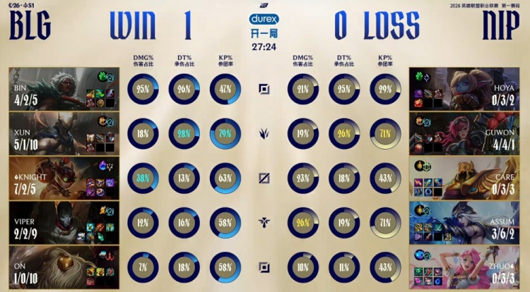 第一局前期打野同时来中,双方1换1。河道再战,Viper烬定住Assum艾希,knight吉格斯跟进击杀,Bin安蓓萨单杀Hoya波比,BLG打出1换3,经济领先2k。