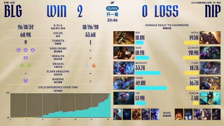 后期大龙团,Xun皇子再次击杀Assum飞机,Viper伊泽瑞尔轻松双杀,BLG打出0换4并拿到大龙,经济领先接近1w。最终BLG打出1换5团灭NIP,一波推平NIP基地拿到赛点。