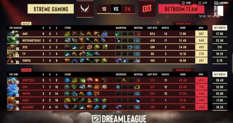 【44分钟】BB主动先手帕克+杰奇洛冰留人,Xxs人马和Fy小Y先后倒下,BB打出0换2之后再拿肉山,kiritych凯带盾!随后高地团XG一波集火没秒掉MieRo剃刀,Ame斯温被kiritych凯晕住回不来了!BB拆掉中路高地之后kiritych凯秒掉Fy小Y,fy小Y交出买活,也就换掉了kataomi杰奇洛!kataomi也交出买活!BB再次追击切死NTS毒龙,XG交出买活但是正面没人扛得住kiritych凯的输出,gpk帕克泉水前捆三个,XG无力防守敲出GG!