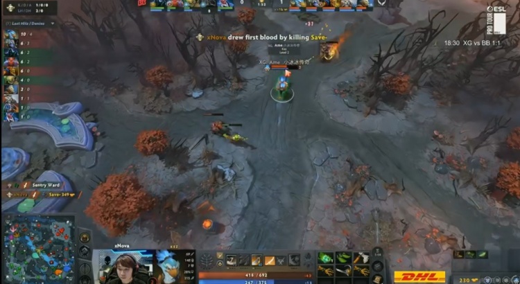 【1分钟】上路对线xNova百戏大王找到机会单杀掉了Save杰奇洛,拿下一血!