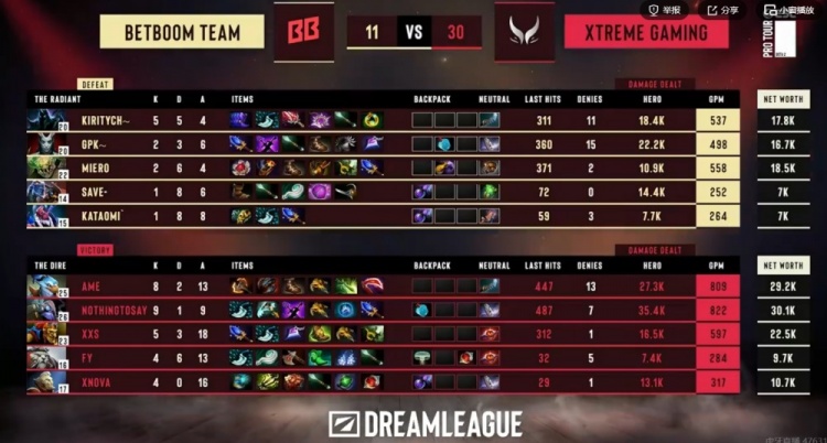【27分钟】XG下路围杀kiritych亚巴顿,拆掉下二塔后又在上路强杀MieRo孽主!Ame凯下路遭遇,两刀直接将kataomi萨尔送回泉水!上路三角野区Save杰奇洛也被逮捕!回头BB还想守中二塔,gpk女王大招击杀Fy海民,但是亚巴顿又被激光减速+Ame凯贴脸,连续阵亡!XG这几波相当于打了个1换5的团灭啊!经济差来到14K了!