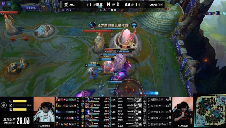 【14:59】Shanks瑞兹开车与Tarzan赵信越塔击杀HongQ岩雀,Junjia龙也没拿,Flandre上路推掉JDG一塔,AL经济领先6.1k。