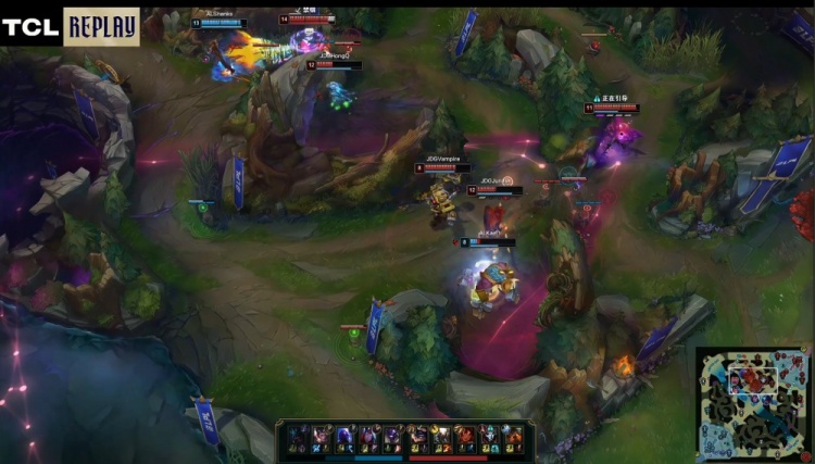 【13:18】河道团战,Junjia潘森跳大来后排先被AL三人集火送王杰韦鲁斯人头,双方上单TP来正面,Xiaoxu兰博闪现被打出。