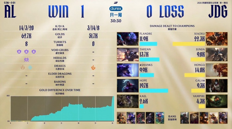 第一局前期上河道团战Tarzan赵信联手Flandre雷克塞打出0换3,Flandre拿到双杀。同时Kael牛头下路闪现击飞JDG两人,Hope韦鲁斯收下V神泰坦人头。随后Shanks去上助力老枪再杀Xiaoxu兰博,AL经济领先2.3k。