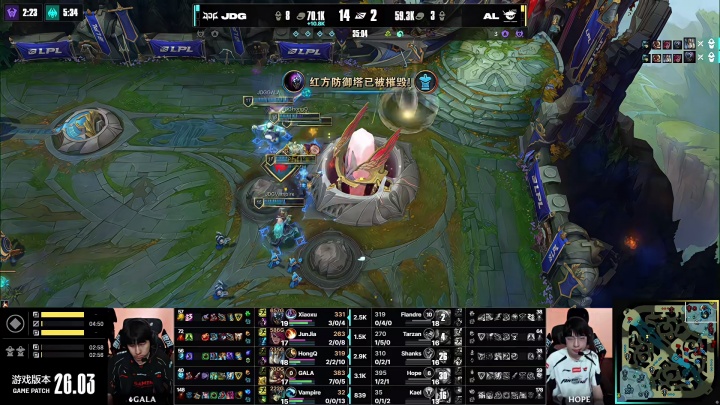 直播吧2月26日讯 今日LPL季后赛胜者组JDG赛点局血虐AL成功手握两个赛点,在本局比赛中JDG对阵AL的人头比也一度来到了14比2。