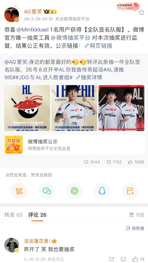 直播吧2月26日讯 今日LPL季后赛胜者组JDG战胜AL后,JDG老板蓝莲花评论AL经理爱笑的抽奖微博:咋开了,笑,我也要抽奖