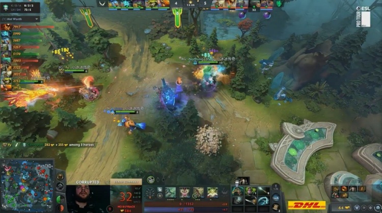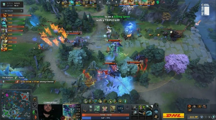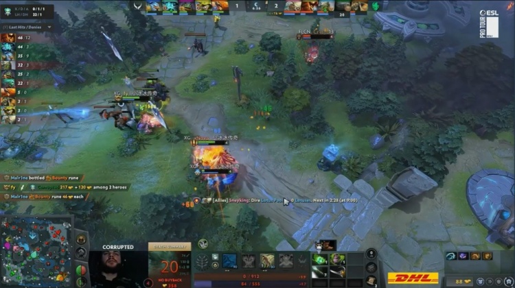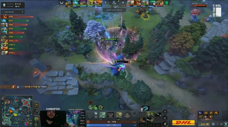 【15:35】下路野区混战,哥哥凯进场1v3被Corrupted的DP反杀,Corrupted爆轰三杀,猎鹰打出0换3,经济领先5k。