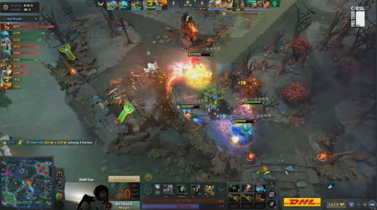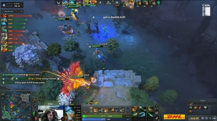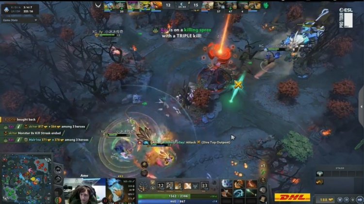 中期skiter影魔击杀Ame凯后,猎鹰打出0换2维持5k优势。随后NTS蓝猫击杀Corrupted死亡先知,Xxs朗戈三杀帮助XG打出1换3将经济差距缩小至1k。X哥朗戈已然无敌,XG拿到二代肉山。