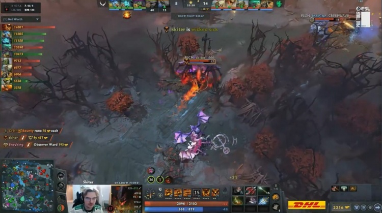 【20:30】猎鹰五人开雾上路推进,哥哥被Skiter影魔见面击杀,猎鹰经济领先5k。