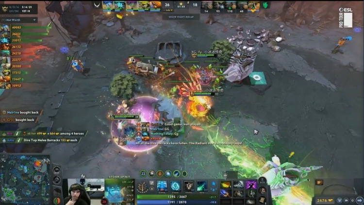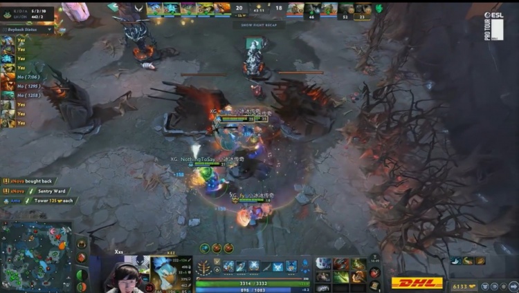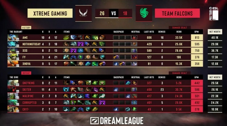 后期Ame凯连续击杀Cr1t小Y与skiter影魔,XG打出1换3并推掉猎鹰两路兵营,XG经济领先来到8k。最终猎鹰正面再无一战之力,Xxs朗戈与Ame凯正面乱杀,XG打出0换3,猎鹰敲出GG,XG扳回一城。