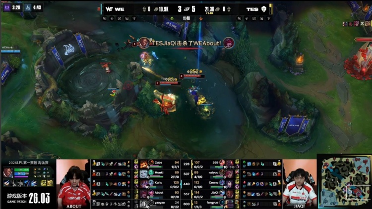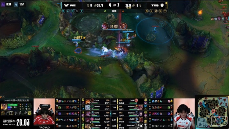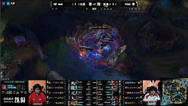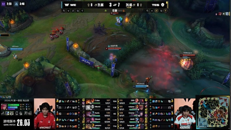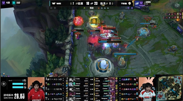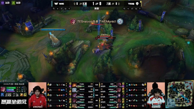 中期小龙团Yaoyao芮尔与About霞先后被杀,TES经济领先2.3k。随后TES下路越塔击杀Cube纳尔并推掉一塔,经济领先2.2k。在WE上野区TES追击过深,Monki佛耶戈拿到双杀,WE打出2换3。