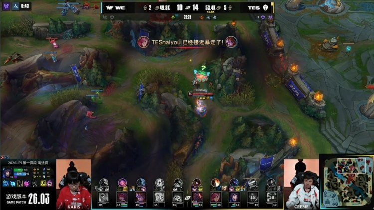 第一局:🎮naiyou潘森全场爆抓 Creme永恩双剑单杀WE双射手 TES赢首局