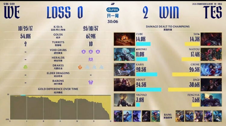 后期在TES上野区大乱斗,Monki佛耶戈一倒WE直接溃败,TES打出2换4。龙魂团TES融化WE五人后拿到风龙魂与大龙,经济领先8k。最终TES上路推进,一波推平平WE基地拿到赛点。