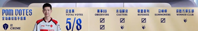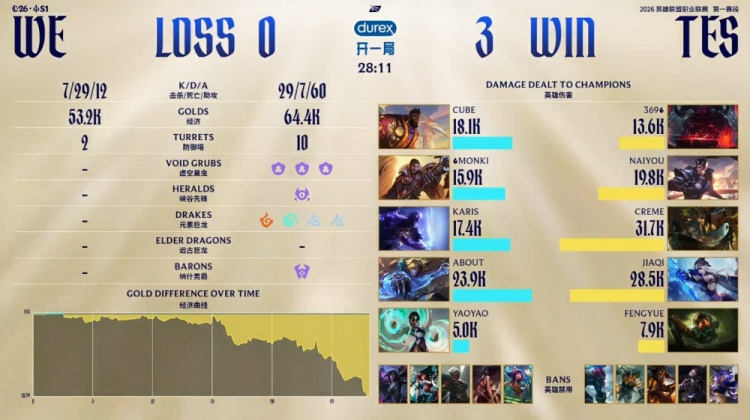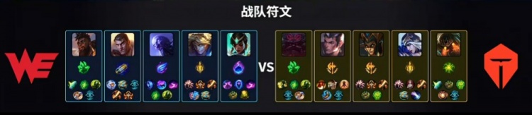 后期老9奥恩中路开团帮助TES打出0换3并拿下大龙,经济领先5k。龙魂团Creme蛇女三杀,TES打出1换5拿到风龙魂,最终WE再无一战之力,老9奥恩三杀收尾,TES打出1换5,一波推平WE基地拿到比赛胜利。