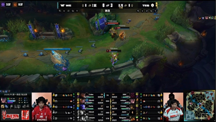 【25:41】TES下路冲上WE高地推掉WE中下两路水晶,TES撤退休整,经济领先8k。