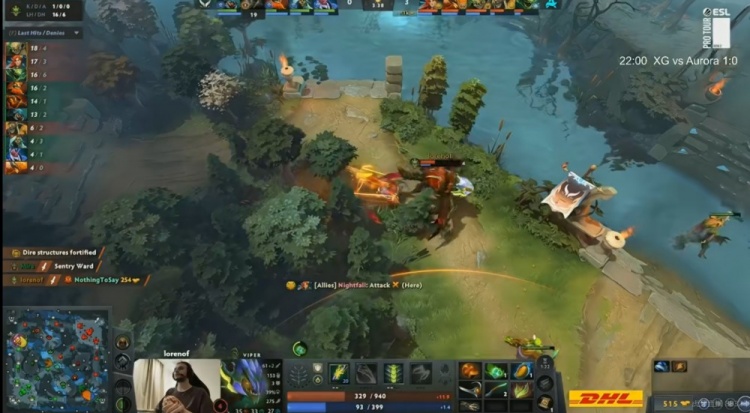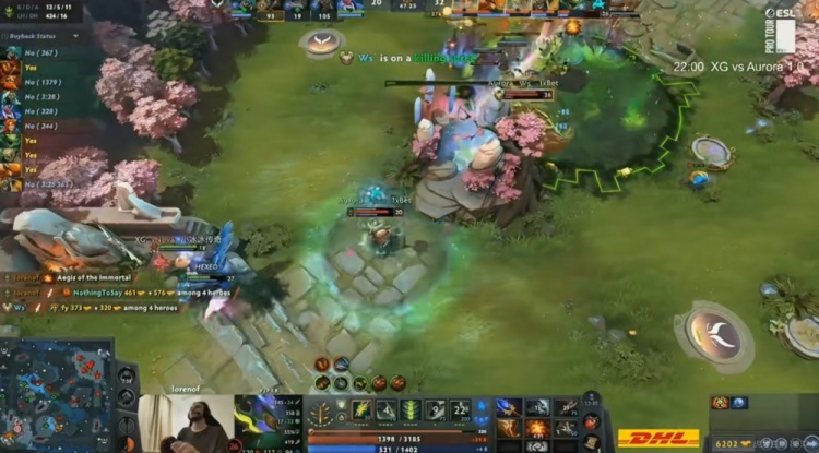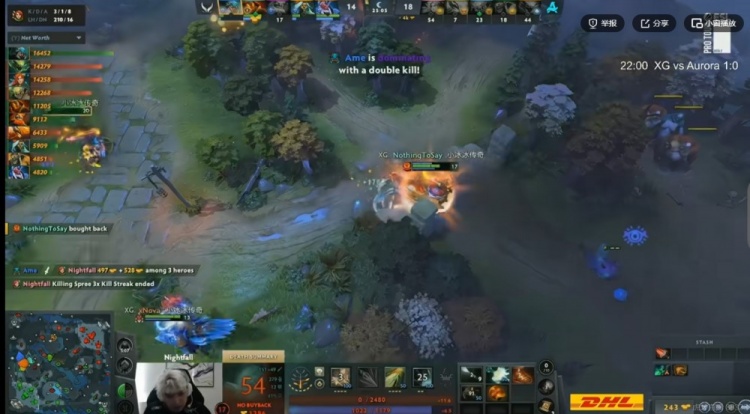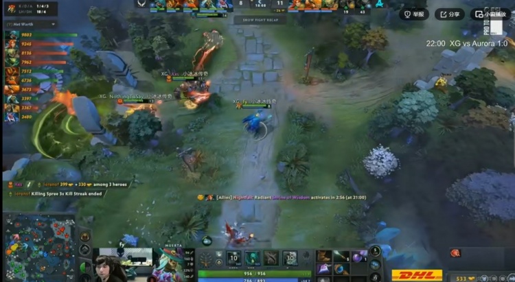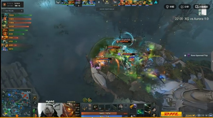 【24分钟】上路团战,XG第一波强行打掉了Kaori凤凰蛋,Ame蚂蚁先打掉Nightfall风行者盾,随后A死了Mira小Y!残局lorenof毒龙尽力输出,但是Ame蚂蚁一个大推推完成反杀!最终NTS买活留住了风行和孽主,这波XG打出2换5团灭Aurora!一波打回4K经济差!