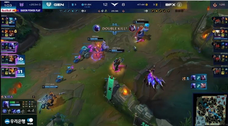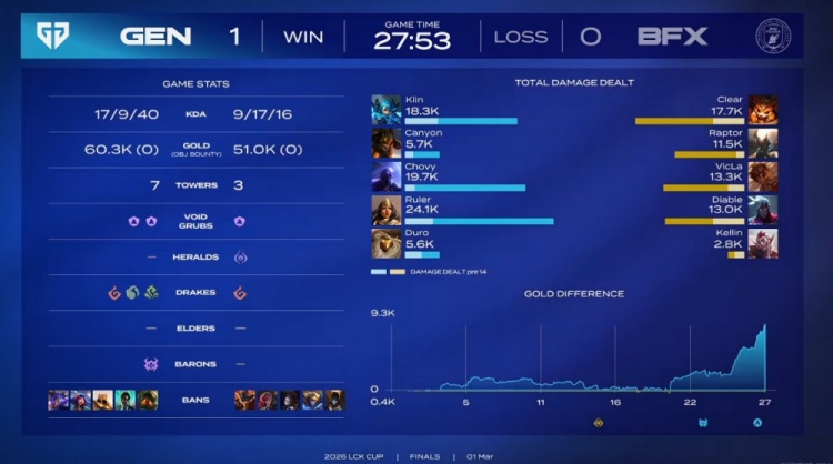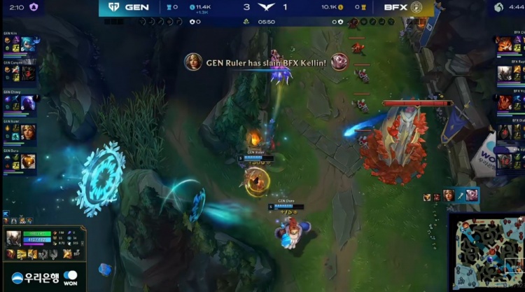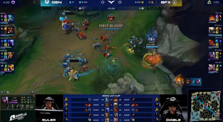 首局比赛Canyon皇子早早抓下帮助下路组打出优势,GEN随后小龙团再打1换3领先接近2K!中期BFX运营+抓单取得成效,一度将经济差抹平,还断了GEN的小龙节奏,但是20分钟下路团Chovy瑞兹+Ruler维鲁斯双核心收割,GEN一波1换3之后再拿优势!