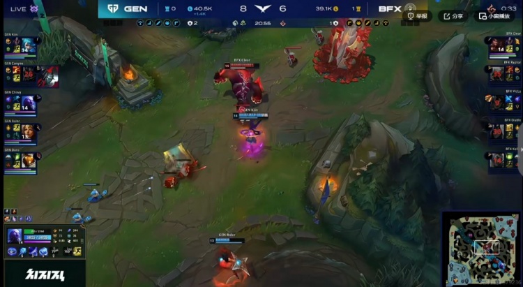 【23:39】BFX上野强行抓死Kiin格温,拆掉了GEN的中下双一塔!GEN其余四人抱团拿下大龙!双方经济差3K不到!