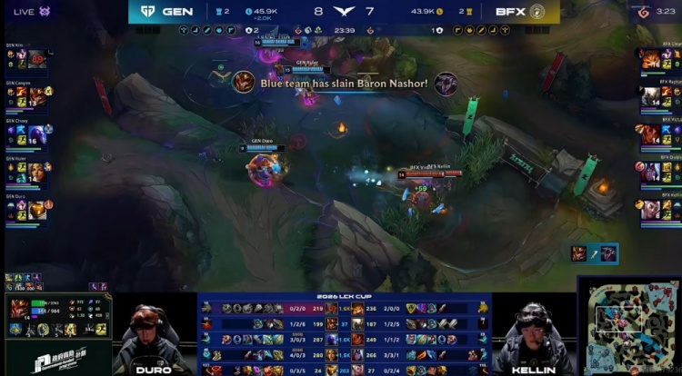 【20:35】下路交手,Chovy瑞兹一套伤害强行灌死了VicLa岩雀,BFX则是换掉了Duro巴德,后续团战Canyon皇子留人自己被集火击杀,但是Ruler希维尔切死了Diable维鲁斯,BFX没有输出点了!GEN双C猛猛输出接管团战!最终是GEN的1换4!