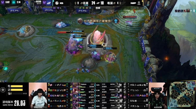 【26:01】iG中下推进拔掉NIP二塔,经济领先来到8k。下路团战,Guwon皇子进场扣人自己被杀,Photic卡莎收割战场三杀收尾,iG打出0换4,一波推平NIP基地拿到赛点。