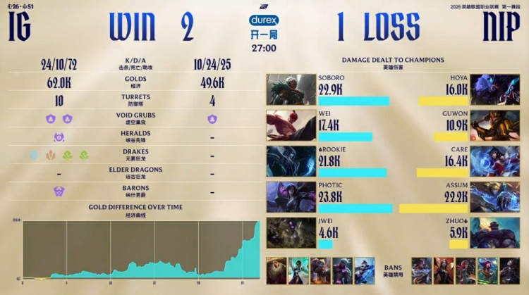 后期,Soboro安蓓萨与Wei盲僧在龙魂团各取双杀,iG轻松拿到炼金龙魂并吃掉大龙,经济领先4k。最终iG下路推进拔掉NIP二塔,Photic卡莎三杀收尾,iG打出0换4,一波推平NIP基地拿到赛点。
