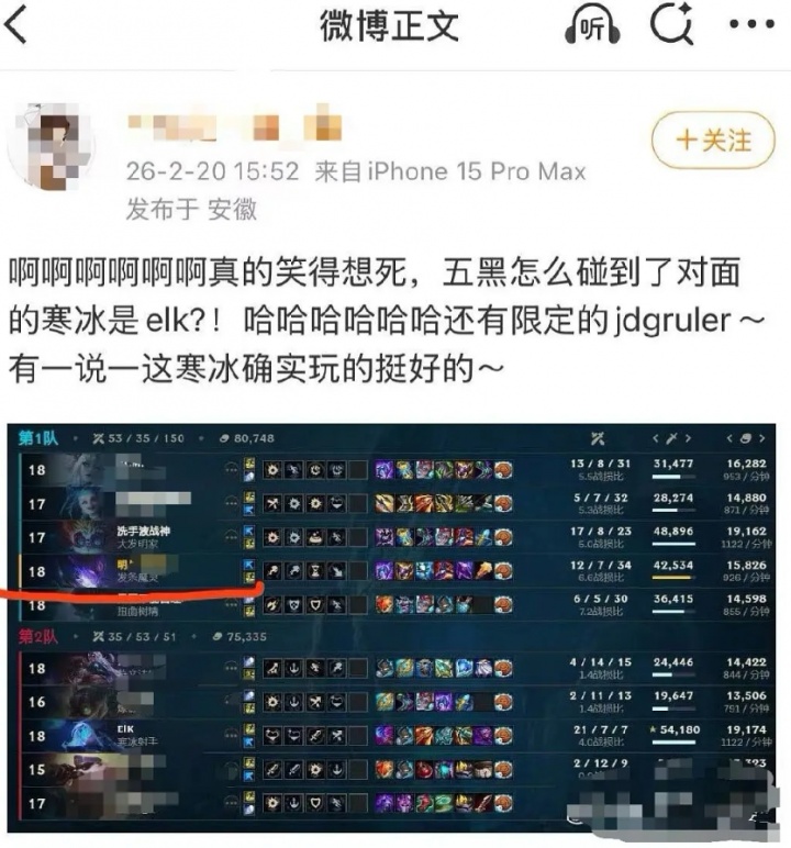 其中“明月下西楼”曾经和ELK匹配撞车,还在自己微博上分享了撞车的游戏后数据截图。