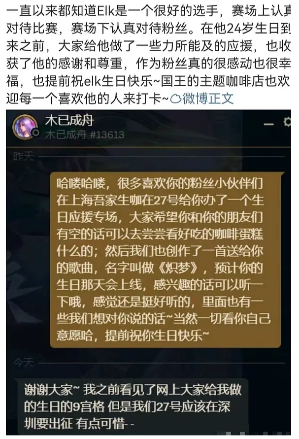 “木已成舟”也在微博上分享过自己和ELK的聊天记录,并且表示曾在上海办过ELK粉丝的应援专场,并且希望ELK能够到场