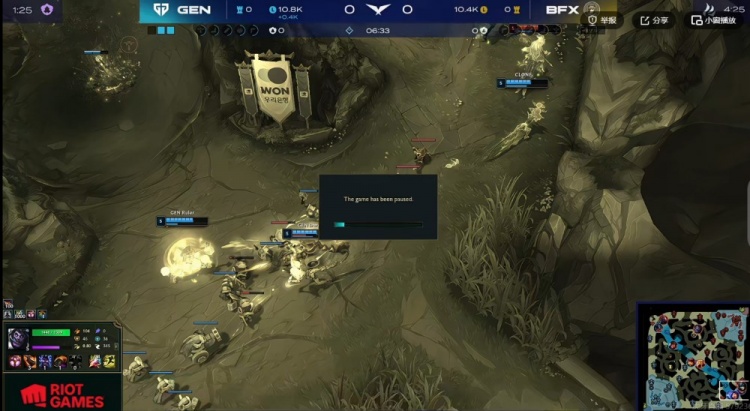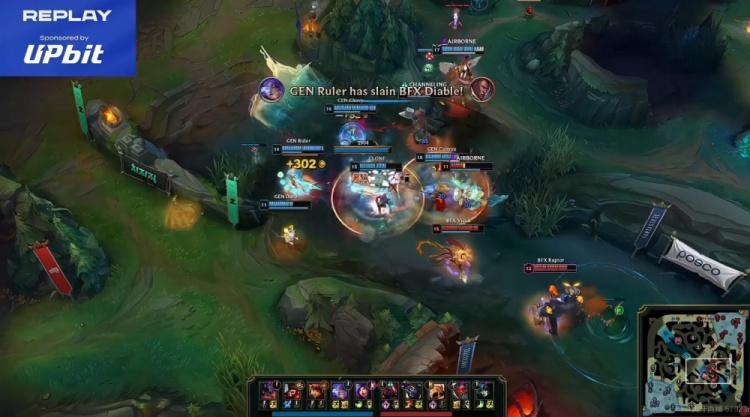【22:30】GEN拿下听牌龙,中二塔下的Diable卢锡安直接被Chovy安妮闪现大配合队友瞬秒了啊!回头BFX抱团换掉了战略点中一塔,打回了1K经济差!