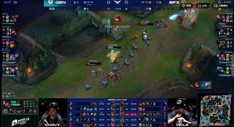 【11:52】GEN中野第一波联动被VicLa沙皇推走,Raptor蒙多支援,但是VicLa残血沙皇有点急了想去追击,结果吃到Canyon猴子二段大,被Chovy安妮回头一发带走!Chovy安妮一血!