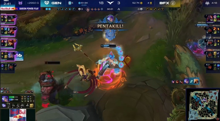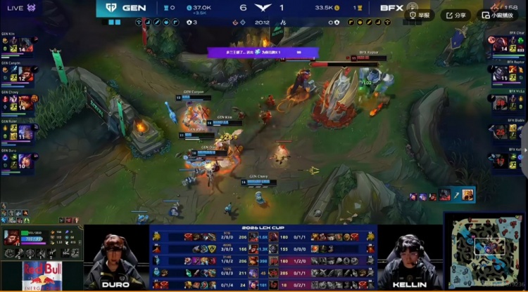 【17:10】GEN拿下第三条小龙!BFX中路放先锋,多打少借助VicLa沙皇绕后逮捕了Duro妮蔻!双方经济差3K左右!