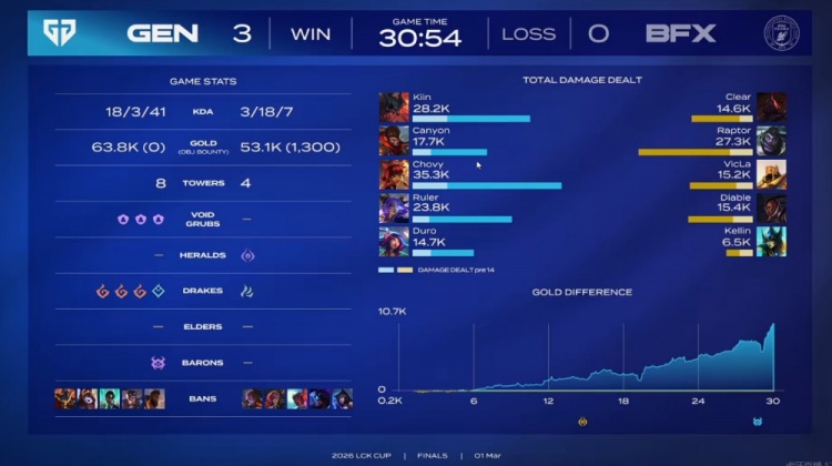 第三局双方前期平稳发育,Chovy安妮配合Canyon猴子击杀VicLa沙皇之后掌握中路主动权,上路没人管则是Kiin剑魔猛猛抽Clear塞恩的陀螺啊!中期BFX急于扭转战局,但是越急就越中了GEN的圈套,Diable卢锡安甚至一个反向闪吃妮蔻大白给了!GEN火龙魂团借助中野双闪现大招拿下火龙魂,随后再拿大龙,Ruler芸阿娜开大配合队友收割拿下五杀结束比赛!GEN横扫BFX,夺得2026年LCK杯的冠军!