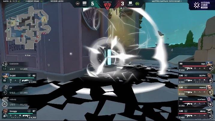 第三局:开局EDG在C点前顶1换1收下一人,随后M8进攻A点收下两人,随后M8进到A点完成下包,M8拿下一分!