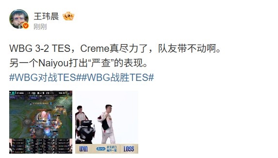 直播吧3月2日讯 LPL第一赛段季后赛WBG 3-2 TES,媒体人王玮晨赛后点评写道: