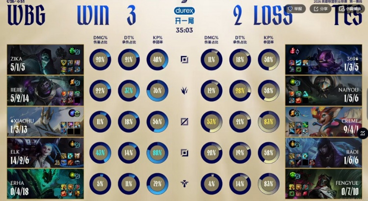 WBG:上单Zika、打野Jiejie、中单Xiaohu、下路Elk、辅助Erha