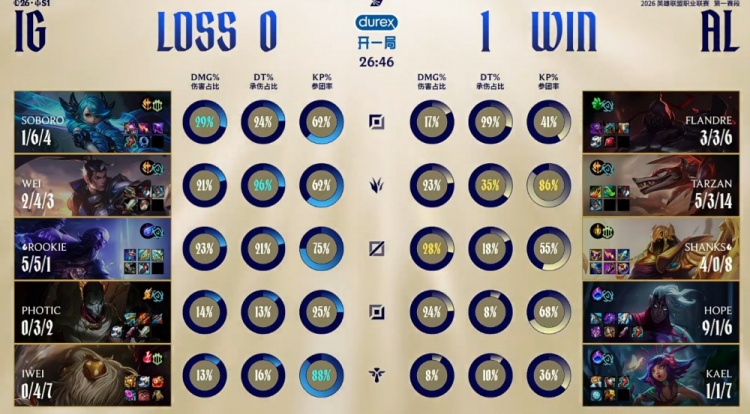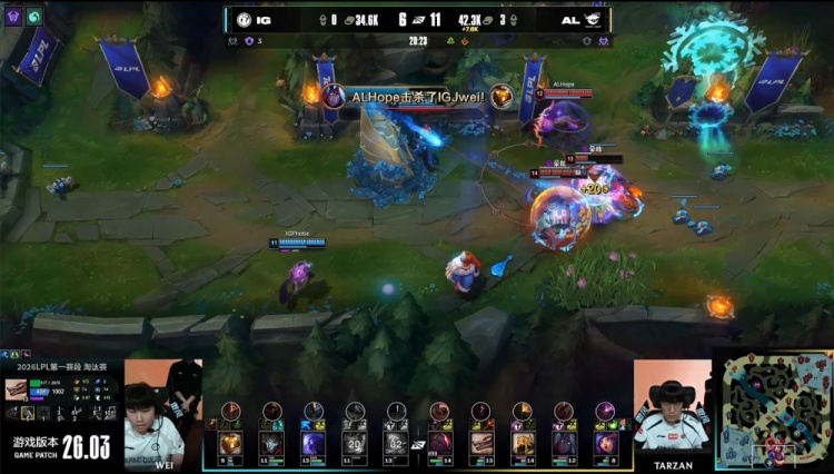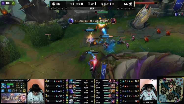 【26:02】iG四人上路逮捕Flandre,AL四人中路冲上iG高地推平iG基地先下一城。