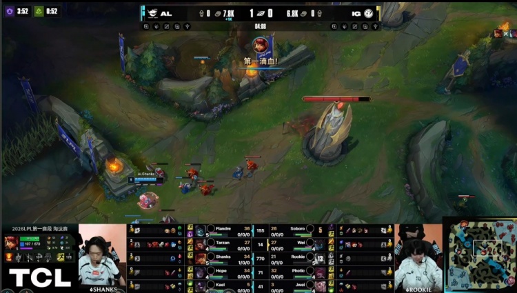 【15:40】Rookie永恩上路推线过深被Shanks安妮再次单杀,Soboro纳尔TP去上落地成盒,AL推掉iG上路一塔,经济领先6.4k。
