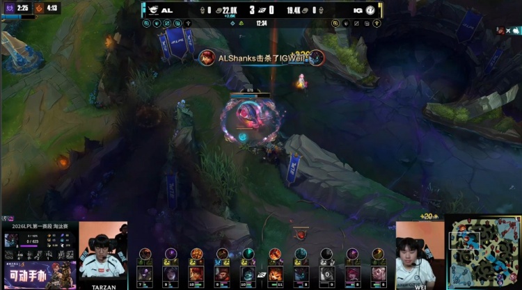 【12:25】Rookie永恩中路大招打空落地被秒,战绩来到0-2-0。Wei茂凯紧接着在河道也被AL中上二人击杀,AL打出0换2,经济领先2.6k。