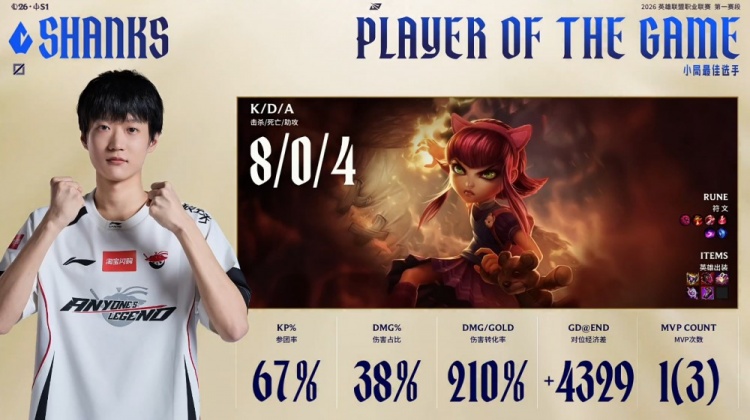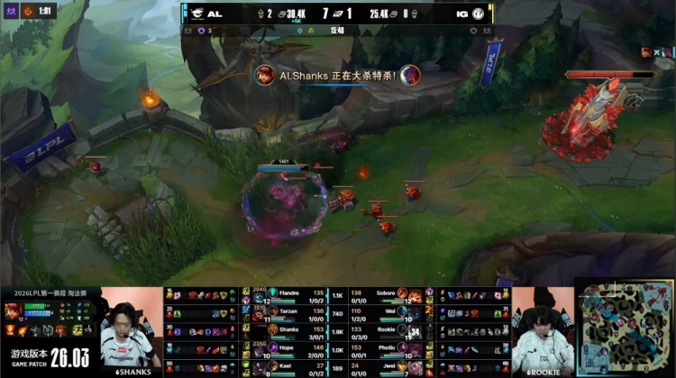 中期Rookie永恩上路被Shanks安妮再次单杀,AL随后听牌火龙魂,经济优势来到8k。