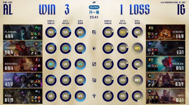 后期Soboro纳尔下路被Flandre掘墓单杀,AL轻松拿到大龙,经济优势来到1w以上。最终AL下路冲上iG高地,Shanks安妮三杀收尾,AL推平iG基地拿到比赛胜利。