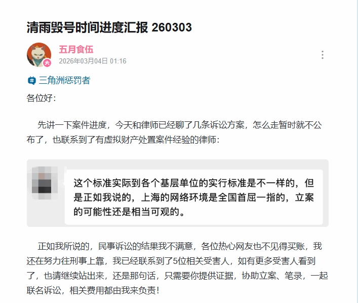 近日,号主五月食伍公开最新维权进展,拒绝和解,坚持追责到底。全力推进法律程序,事件仍处于舆论发酵与司法准备阶段。