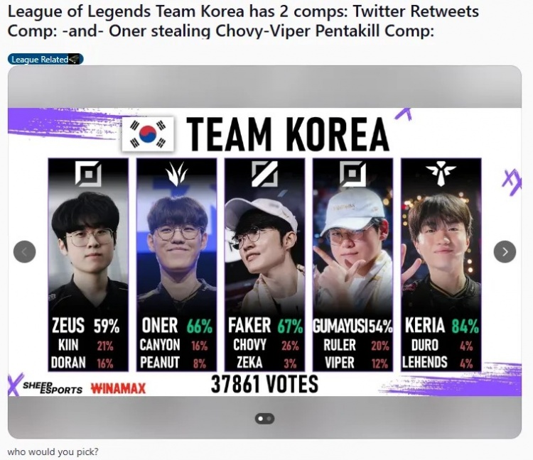 “英雄联盟韩国代表队有两套阵容:推特转发流量队以及Oner狂抢Chovy和Viper五杀队,你会选哪个?”