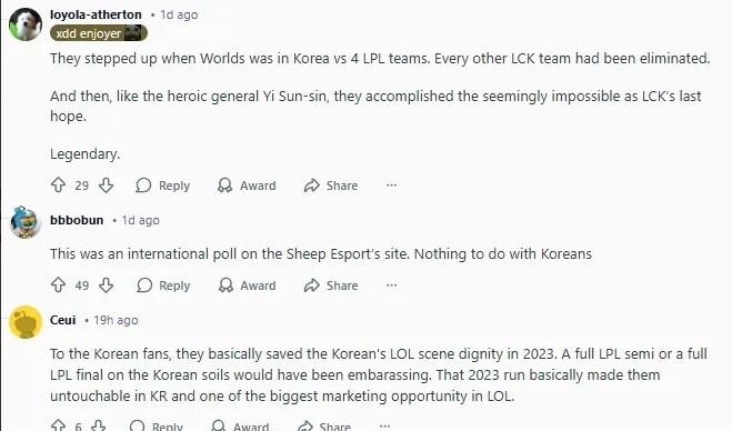 对韩国粉丝来说,他们在2023年基本上挽回了韩国LOL界的尊严。在韩国本土出现全LPL的半决赛或决赛将会是件很尴尬的事。2023年的那段征程基本上让他们在韩国国内变得神圣不可侵犯,也成为了LOL中最大的商业机会之一。