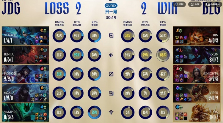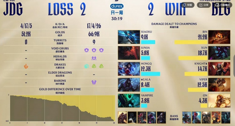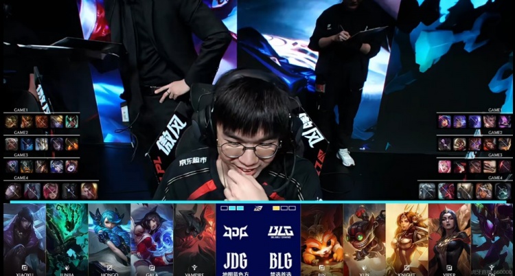 第四局Junjia剑魔反常规反野欺负Xun卡兹克但是送出一血!随后JDG上路一波越塔结果配合失误+xiaoxu格温大招空掉被BLG反手1换3!这波之后Bin纳尔和Xun卡兹克都发育拦不住了!中期BLG纳尔+knight乐芙兰单带+Viper炸弹人推塔无解,Xun卡兹克更是来去自如疯狂刷野,对位压了2级多毫无压力!最终BLG仅仅20分钟拿下一万经济优势,河道团瞬秒GALA厄斐琉斯打出0换4,将比赛拖入了决胜局的较量!