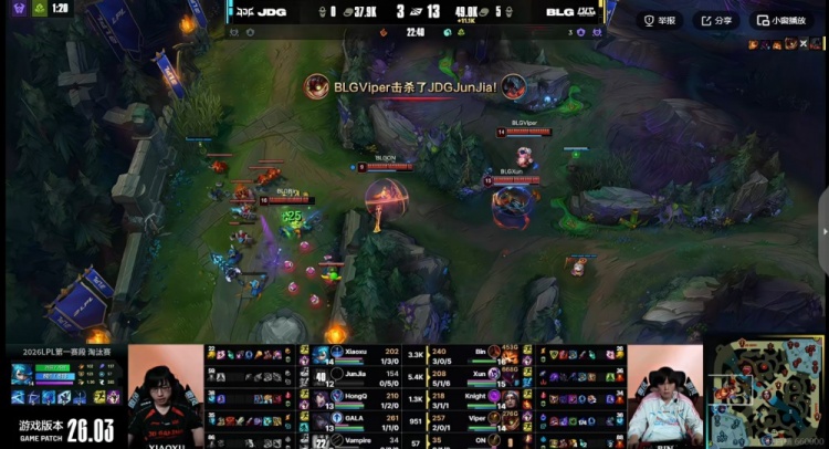 【22:40】Bin大纳尔野区一拍配合Viper炸弹人大招秒掉Vampire锤石,回头ON曙光R+指再留到了没闪的Junjia剑魔!这波BLG打出0换2,回头拿下大龙!
