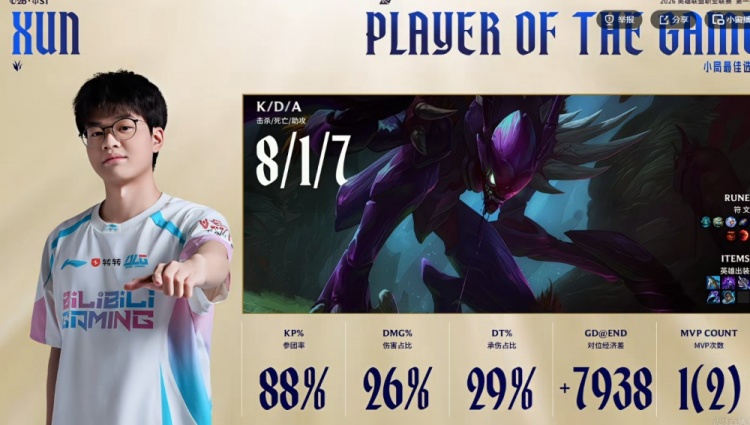 【12:07】Bin纳尔上路先手拍+ON曙光ER+Xun卡兹克W,BLG三人一套配合直接秒掉了xiaoxu格温!