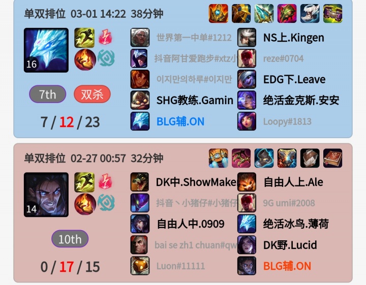 对此,有网友去韩服翻出ON的排位记录发现,ON选手疑似研发塞拉斯辅助失败,灵机一动学了一手冰鸟辅助!不过该场对局中前JDG上单Ale与DK中单ShowMaker的战绩也十分显眼。