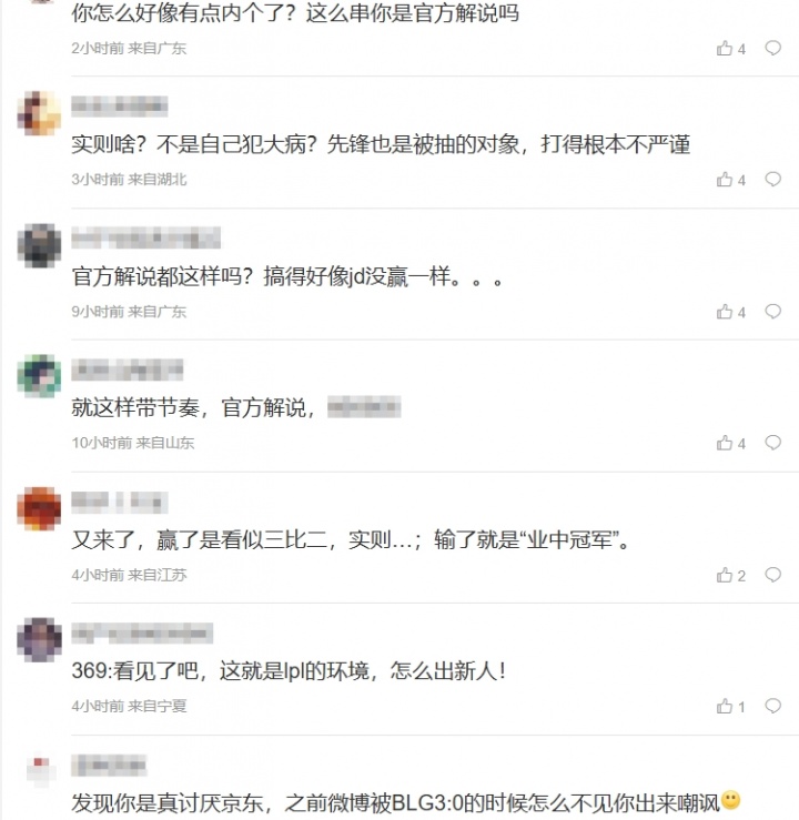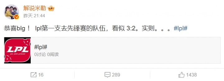 直播吧3月5日讯 在昨日的LPL胜者组决赛上,BLG以3-2的比分击败JDG,赛后解说米勒更博却因一句“看似 3:2。实则。。。”的言论,评论区惨遭JDG粉丝爆破!